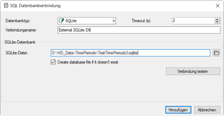 Für die Datenbankverbindung müssen ein Verbindungsname, ein SQLite-Dateipfad und ein Timeout konfiguriert werden. Mit dem Button <Test connection> können Sie die Verbindung überprüfen.