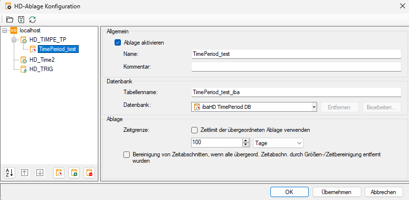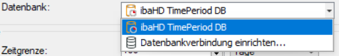 Name der ausgewählten Datenbank, die die Zeitabschnittstabelle enthält. ibaHD-Server legt eine Datenbank für Zeitabschnitte standardmäßig als interne SQLite-Datenbank an. Wenn Sie die interne Datenbank nutzen wollen, wählen Sie ibaHD TimePeriod DB aus.