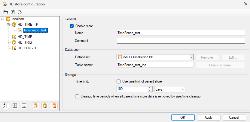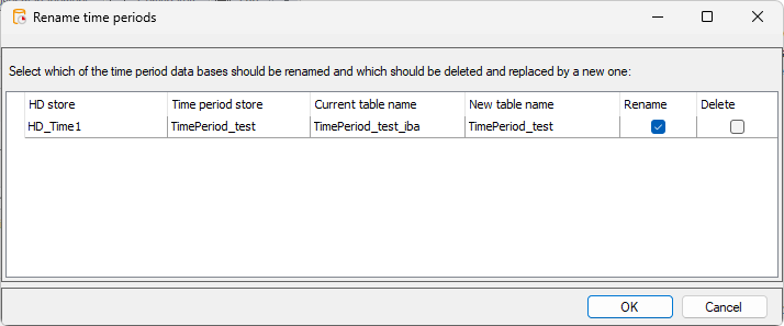 If the time-period store is saved in an external database, first change the name of the database table and associated metadata table in the database system and then adjust the configuration in ibaHD Manager. |