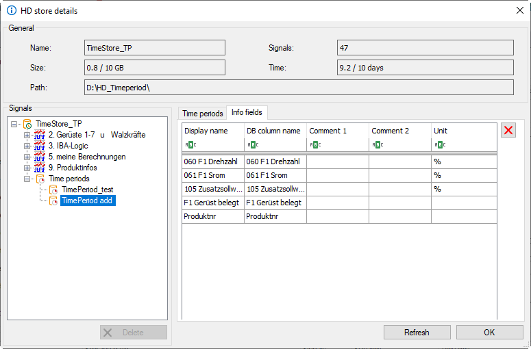 If one of the available time periods is selected in the HD store details dialog, the time periods that exist in the database can be viewed in a table. The calendar fields can be used to restrict the range of time periods displayed. A maximum of 100 time periods can be displayed in the table.