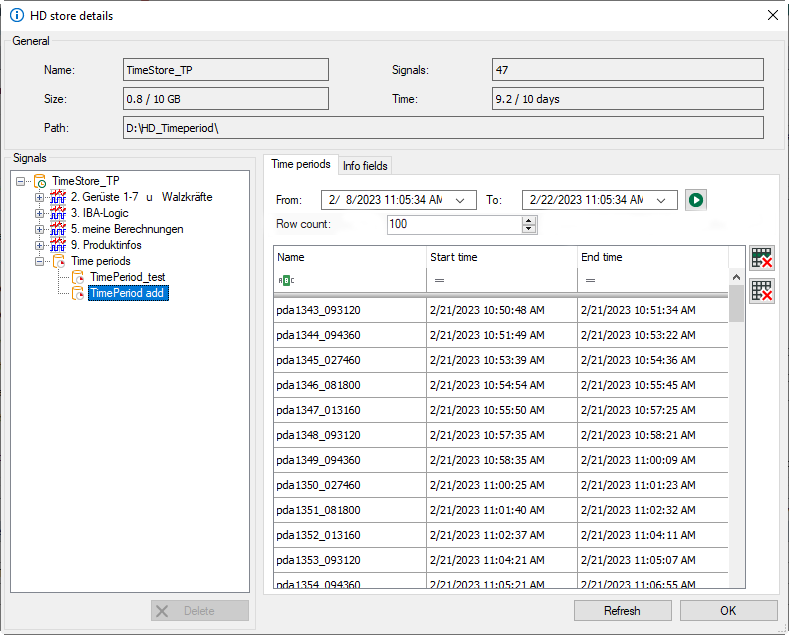 If one of the available time periods are selected in the HD store details dialog, the time periods that exist in the database can be viewed in a table. The calendar fields can be used to restrict the range of time periods displayed. A maximum of 100 time periods can be displayed in the table.