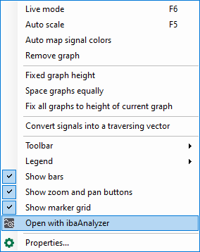 If the HD trend graph is paused, you can open the displayed time range in ibaAnalyzer. To do this, open the context menu and select Open with ibaAnalyzer.
