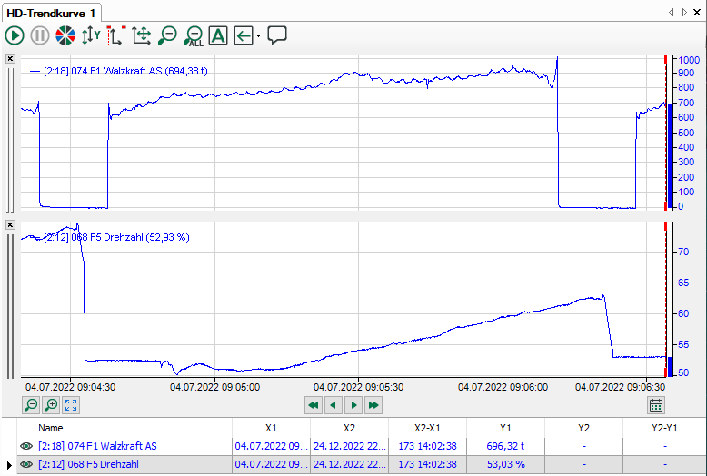 The display of the historical trend graph is the same as that of the normal trend graph with the difference that the data comes from the ibaHD-Server and not from the ibaPDA server. In case of time based storage, the signal can be displayed during the whole recording period.