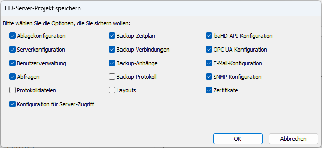 Um ein Projekt zu sichern, wählen Sie die zu speichernden Optionen und klicken Sie auf <OK>.