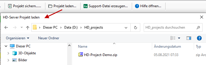 Um ein Projekt zu laden, wählen Sie die gewünschte Projektdatei im Dateibrowser aus und klicken auf <Öffnen>.