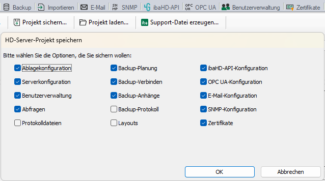 Um ein Projekt zu sichern, wählen Sie die zu speichernden Optionen und klicken Sie auf <OK>.