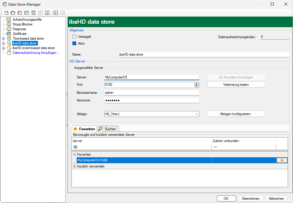 Wählen Sie einen HD-Server aus, an den die HD-Datenaufzeichnung ihre Daten senden soll. Wenn Sie einen ibaHD-Server mit aktivierter Benutzerverwaltung auswählen, müssen Sie auch Benutzername und Kennwort eingeben. Um die Einstellungen zu überprüfen, klicken Sie auf <Verbindung testen>.