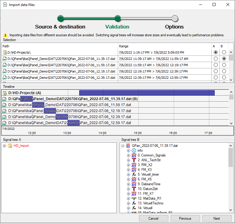 There are two signal tree windows A and B in the lower area. You decide which signal tree is displayed using the option fields in columns A and B of the table above. This allows you to compare the signal trees and check, for example, whether the data file and destination store match. Differences between the signal trees are highlighted with red font.