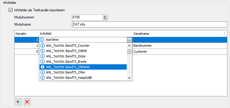 Öffnen Sie in der Spalte Infofeld die Auswahlliste und wählen Sie das gewünschte Infofeld aus. Es werden die systemeigenen Infofelder sowie alle projektierten Textkanäle angezeigt.