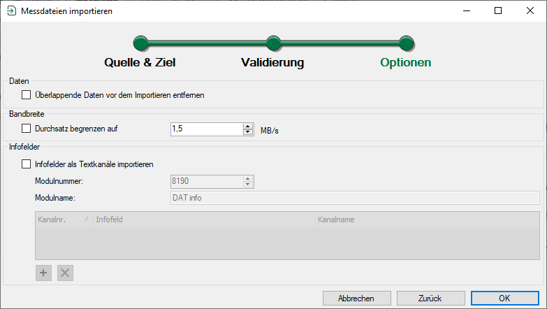 In den Optionen können Sie weitere Einstellungen für den Import der Messdateien aktivieren oder deaktivieren. Für weiterführende Informationen zum Import siehe Messdateien importieren.