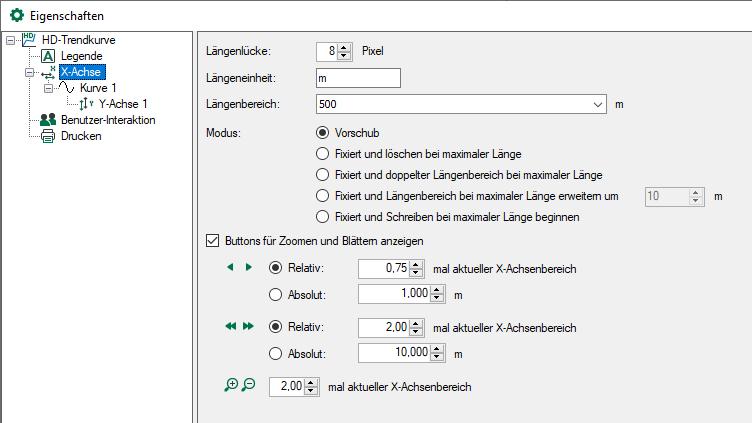 In der Praxis kann der aktuelle Wert allerdings davon abweichen, weil die Länge der Längenachse auch von der Längenbasis für die Aufzeichnung abhängig ist. Eine längenbasierte HD-Trendkurve kann maximal 50 000 Samples pro Signal darstellen. Wenn beispielsweise eine Längenbasis von 1 mm gewählt wurde, dann wird der Längenbereich automatisch auf 50 m begrenzt – egal, welchen Wert Sie hier eingestellt haben.