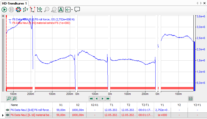 Wenn Sie einen Marker auf eine Lücke zwischen den Graphen platzieren, dann wird als X-Wert stets der Maximalwert der vorhergehenden Messung angezeigt. So lässt sich beispielsweise sehr einfach die Gesamtproduktlänge bestimmen. |