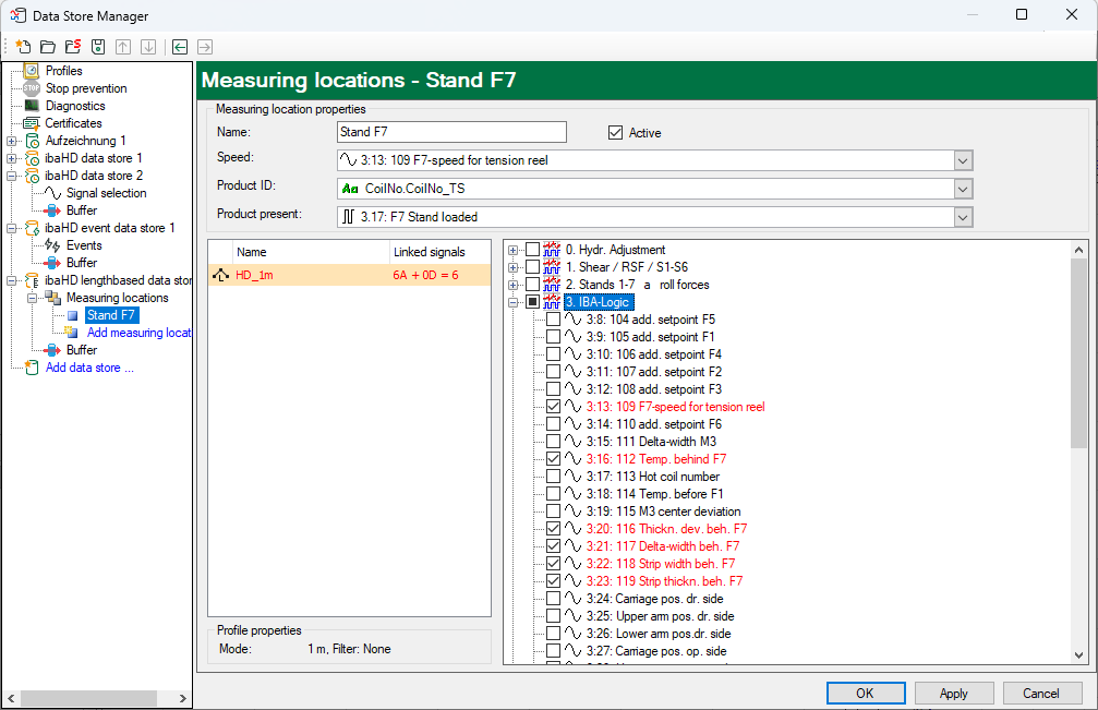 After configuring the HD data store, measuring locations have to be defined. The associated signals can then be assigned to the measuring locations with the appropriate recording profile.