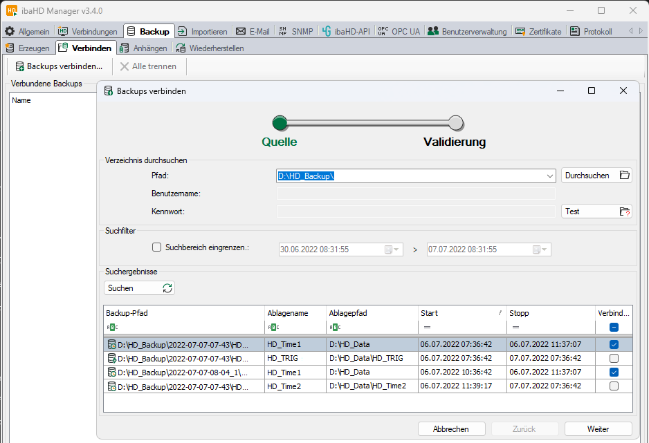 Wählen Sie im ibaHD Manager, Register Backup – Folgeregister Verbinden den Button <Backups verbinden…>.