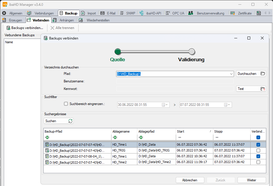 Wählen Sie im ibaHD Manager, Register Backup – Folgeregister Verbinden den Button <Backups verbinden…>.