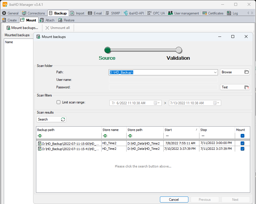 In the ibaHD Manager, select the Backup tab – follow-up tab Mount – button <Mount backups...>.