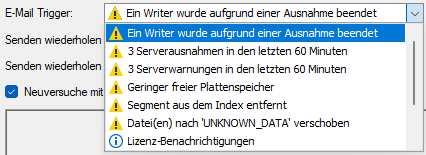 Ein Segment wird aus dem Index entfernt, wenn die Datei des Segments nicht mehr existiert. Bisher wurde in diesem Fall eine Meldung in die Protokolldatei geschrieben, was leicht zu übersehen war. Mit dem neuen E-Mail-Trigger "Segment aus Index entfernt" wird immer dann eine E-Mail versendet, wenn der Fall eintritt. Die Nachricht in dieser E-Mail enthält den Namen des Segments, das aus dem Index entfernt wurde, den Zeitbereich der Daten in dem Segment, die Ablage, zu der das Segment gehörte, und den Pfad, in dem die Segmentdatei hätte liegen sollen.
