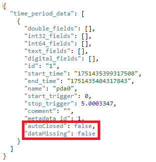 Zusätzlich zu den Infofeldern für Daten verfügen Time-Periods über Standard-Infofelder, die Metainformationen enthalten, z. B. Name, ID, Startzeitpunkt, etc. Ab ibaHD-Server v3.5.0 gibt es die beiden neuen Standard-Infofelder "autoClosed" und "dataMissing" in Verbindung mit ibaPDA v8.12 oder höher. Sie können über die API oder mit aktuellen Versionen von ibaAnalyzer wie jedes andere Standard-Infofeld abgefragt werden.