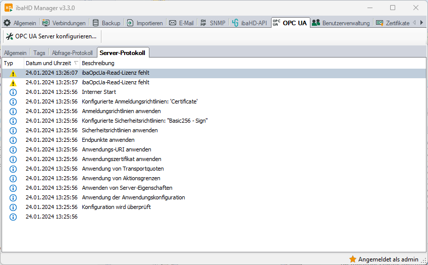 Im Register Server-Protokoll werden alle Server-Aktionen und OPC UA-bezogenen Meldungen in chronologischer Reihenfolge angezeigt.