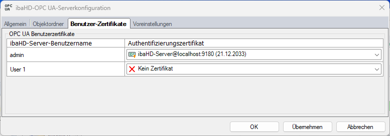 Das Register Benutzerzertifikate wird angezeigt, wenn das Kontrollkästchen Benutzerzertifikate im Register Allgemein der OPC UA-Server-Konfiguration aktiviert ist