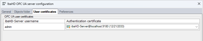The User certificates tab is displayed if the User certificates check box is selected on the General tab in the OPC UA server configuration.