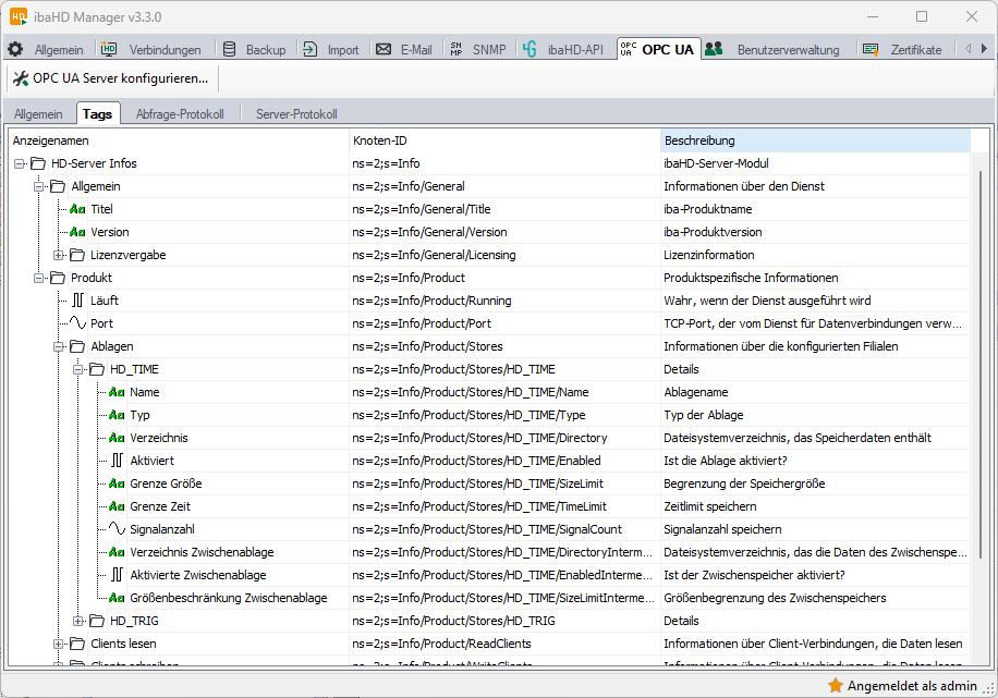 Abhängig von den Zugriffsrechten des aktuellen ibaHD Manager-Benutzers können einige Knoten ausgeblendet sein. |