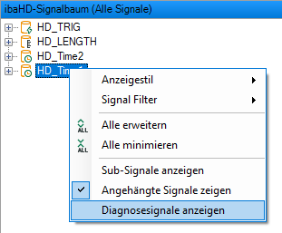 Um die Anzeige der Diagnosedaten zu aktivieren, machen Sie bei gedrückter <Umsch>-Taste einen rechten Mausklick in das HD-Signalbaumfenster. Das Kontextmenü enthält dann (im Gegensatz zum einfachen rechten Mausklick) nun die Optionen "Diagnosesignale anzeigen" und "Angehängte Signale anzeigen". Siehe auch Kapitel Angehängte Signale anzeigen.