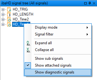 To enable the display of the diagnosis data, perform a right mouse click with depressed <Shift> key in the HD signal tree window. The context menu now contains (contrary to the simple right mouse click) the options “Show diagnostic signals” and “Show attached signals”, see also chapter Show appended signals.