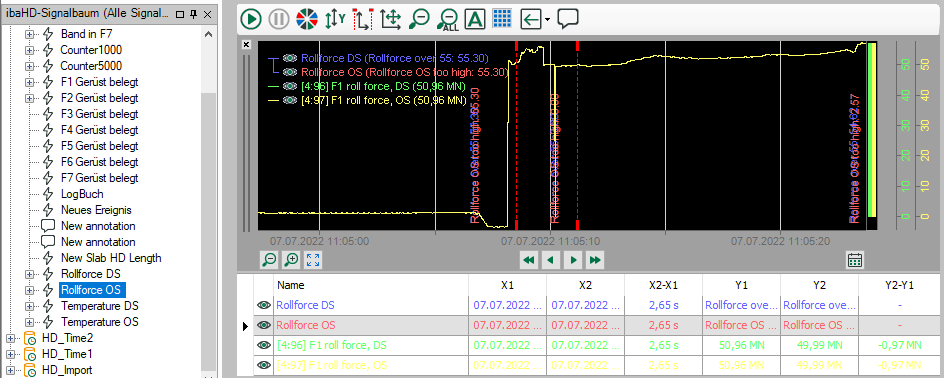 Die folgenden beiden Abbildungen zeigen beispielhaft das Ereignis mit dem Namen „Rollforce OS“ in einer zeitbasierten Trendkurve. Die zweite Abbildung zeigt eine gezoomte Darstellung des Auslösezeitpunktes.
