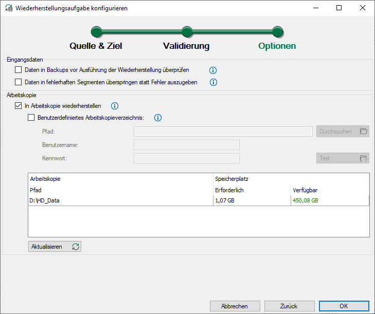 Aktivieren Sie diese Option, wenn in der Zielablage nicht mehr genügend Speicherplatz für die Arbeitskopie vorhanden ist. Sie können dann ein benutzerdefiniertes Verzeichnis angeben, auf dem die Arbeitskopie erstellt wird. Wenn ein UNC-Netzlaufwerk verwendet wird, dann muss dieses Netzlaufwerk während der gesamten Wiederherstellung erreichbar sein.