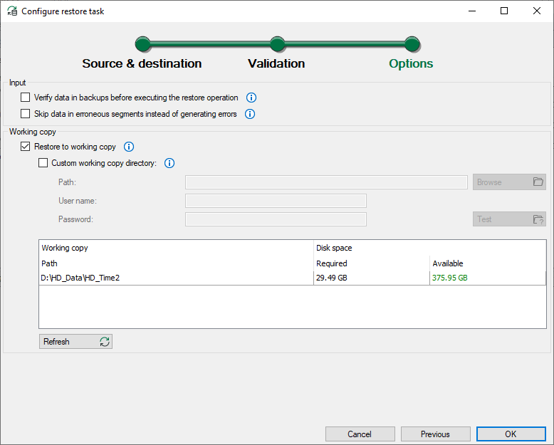 Enable this option if there is no more sufficient memory capacity for the working copy in the destination store. You can then specify a custom directory on which the working copy is to be created. If a UNC network drive is being used, then this network drive must be accessible during the entire restore.