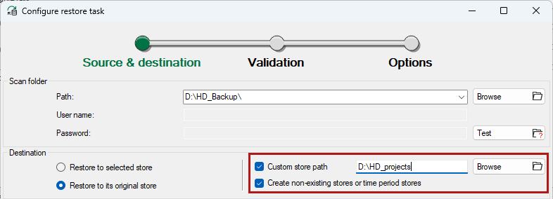 If you have selected the restoration in the original stores under Destination, then this option is also enabled.