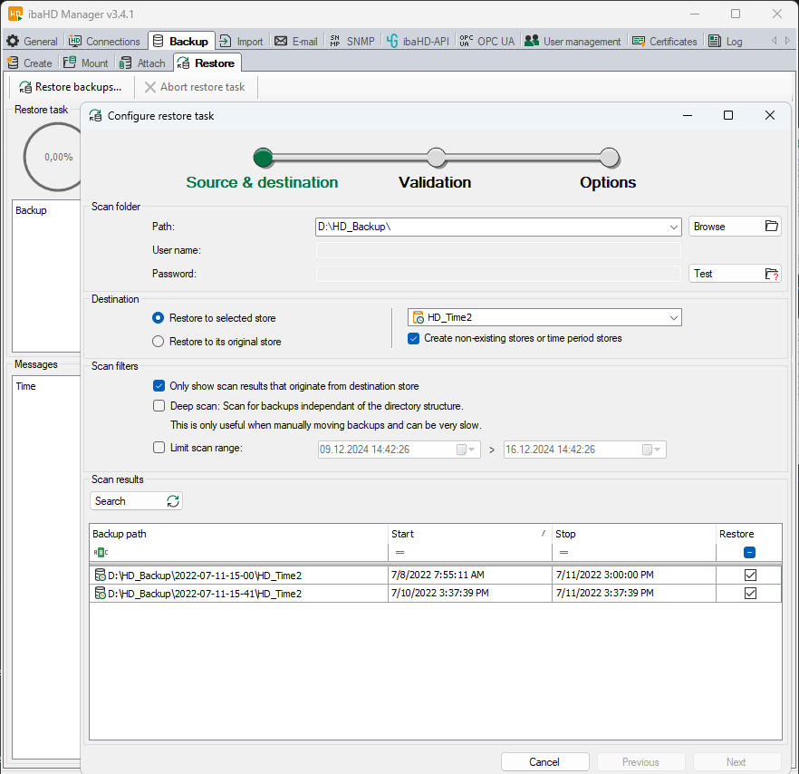 In the ibaHD Manager, select the Backup tab – follow-up tab Restore, button <Restore backups…>.