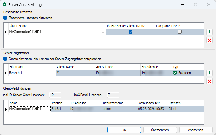 Im Abschnitt Client-Verbindungen, unten im Dialogfenster, werden die verfügbaren ibaHD-Server-Client-Lizenzen und ibaQPanel-Lizenzen angezeigt.