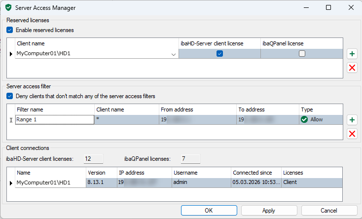 By setting up server access control, you have the option of reserving licenses for selected users and limiting access to the ibaHD-Server.