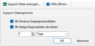 iba empfiehlt bei Auftreten eines Problems eine aktuelle Support-Datei an den iba-Support zu schicken.