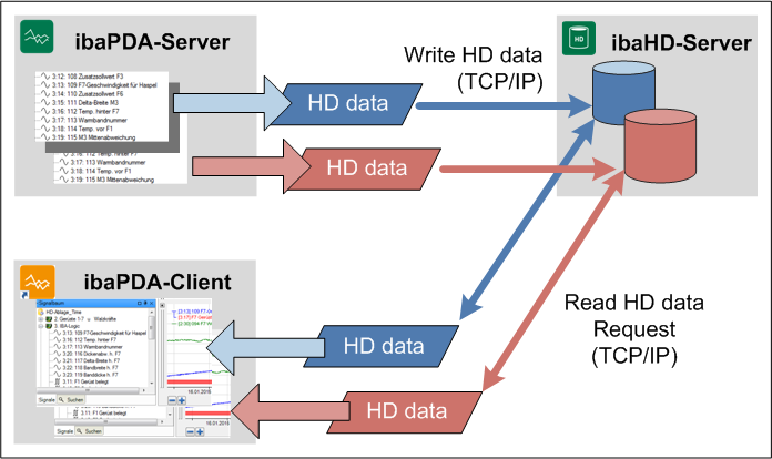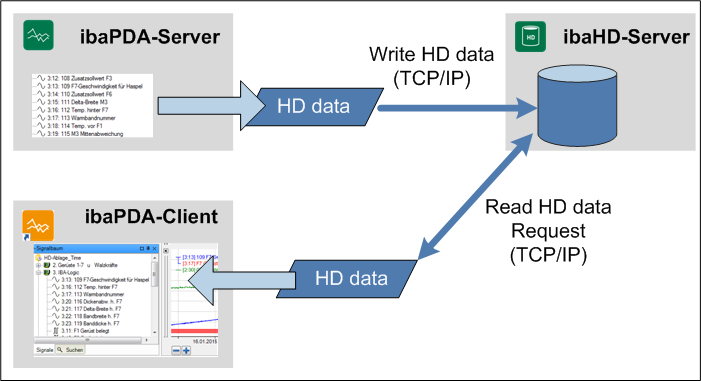 The ibaHD-Server is operated and configured via the client component. The HD client component is completely integrated in the ibaPDA client. Moreover, the client component makes available the display function of the historical data in the ibaPDA client.