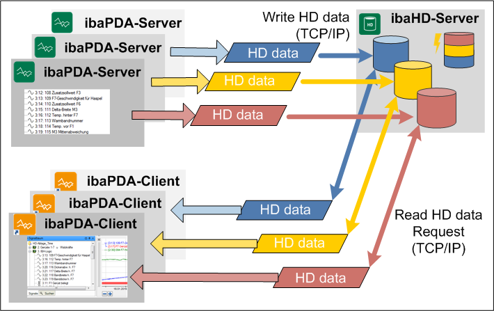 ibaPDA (server) continuously provides ibaHD-Server with measured data which is stored over weeks, months or years in a special file structure. The data is organized and stored in so-called HD stores on ibaHD-Server. The term HD store designates the physical (hard disk) storage area which is sized and reserved for an HD data store.