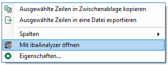 Ausgewählte Time-Periods können direkt in ibaAnalyzer geöffnet werden. Markieren Sie hierzu eine Zeile in der Time-Period-Tabelle und wählen aus dem Kontextmenü den Befehl In ibaAnalyzer öffnen. Dabei werden die Infofelder der Time-Period angezeigt und der Name der Time-Period wird als Dateiname verwendet.