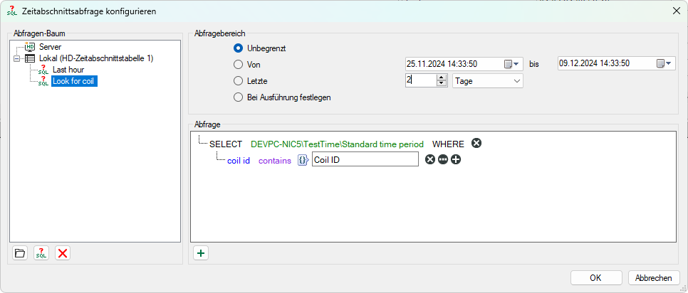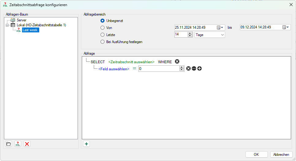 Letzte xx Minuten/Stunden/Tage/Wochen/Monate: Die Abfrage erstreckt sich nur auf einen fest vorgegebenen Zeitraum ab Start der Abfrage, z. B. die letzten 8 Stunden für einen Schicht-Überblick.
