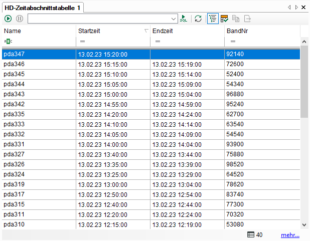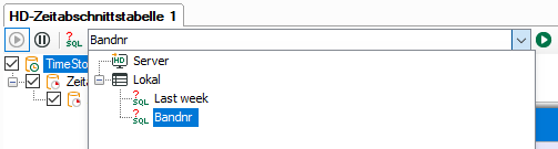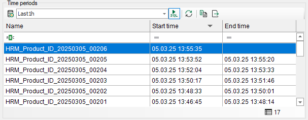 In der Symbolleiste der HD-Time-Period-Tabelle können Sie die angezeigten Zeilen nach bestimmten Kriterien filtern. Geben Sie einen Wert ein oder konfigurieren Sie eine Abfrage, indem Sie auf das Symbol klicken. Wenn Sie den Wert entfernen, wird der Filter wieder gelöscht.