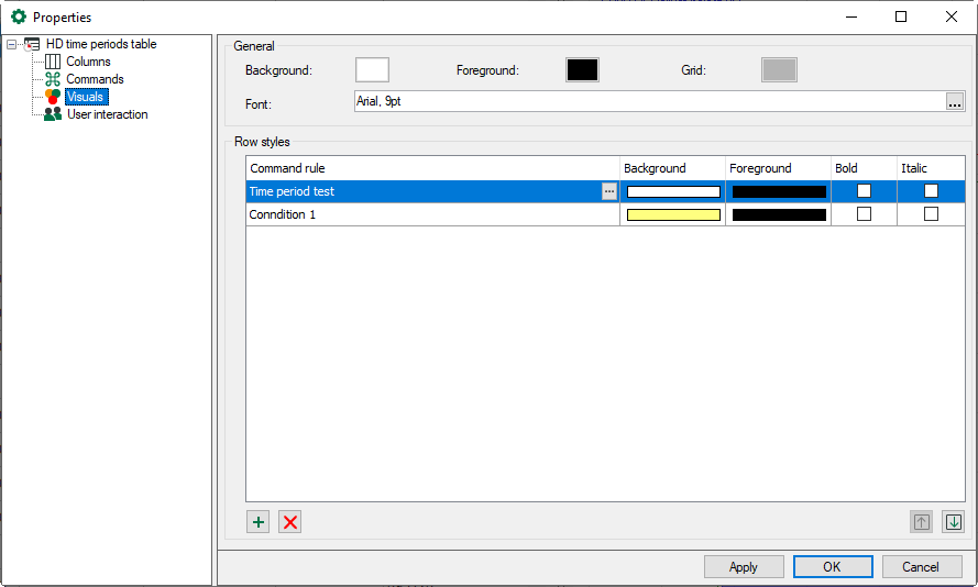 The row style can be controlled depending on the properties of the time periods. In the Row styles list, you can create rules and associated style modifications.