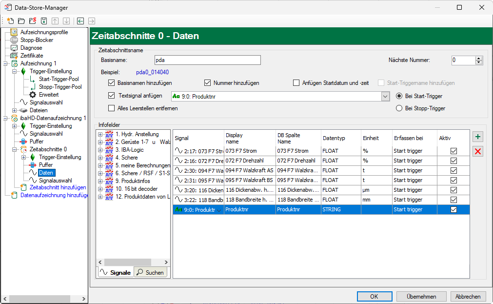 Im Knoten Daten können Sie konfigurieren, wie Zeitabschnitte benannt werden und welche Infofelder geschrieben werden sollen. Sie können einen Basisnamen definieren und auswählen, welche Parameter zum Zeitabschnittsnamen hinzugefügt werden sollen: eine (laufende) Nummer, Startdatum und Startzeit, Start-Triggername, Wert eines Textsignals.