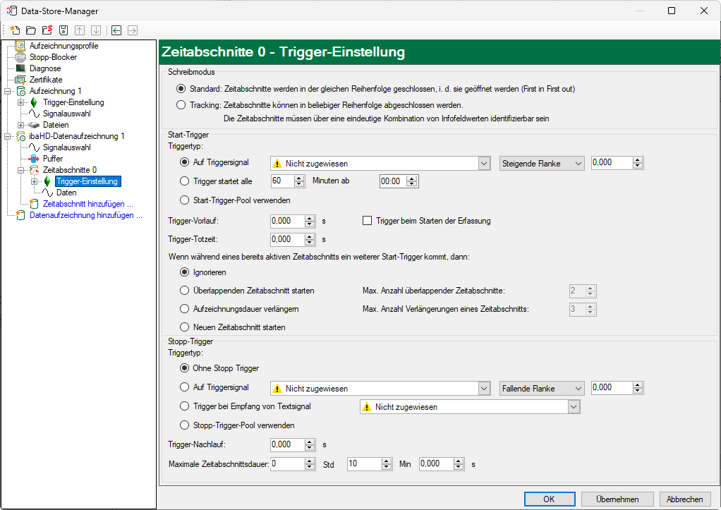 Wenn der Zeitabschnitt direkt beim Start der Erfassung starten soll oder sobald eine neue Datenaufzeichnungskonfiguration übernommen wurde, dann muss zusätzlich die Option Trigger beim Starten der Erfassung aktiviert werden. Wenn Sie die Option nicht aktivieren, startet der Zeitabschnitt erst, wenn der Trigger auslöst.