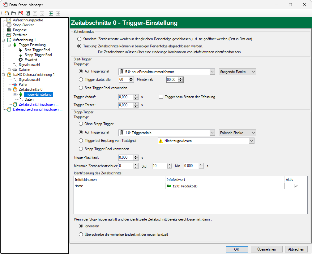 Im Tracking-Modus werden offene Zeitabschnitte nicht automatisch geschlossen, wenn die Erfassung gestoppt oder eine neue Datenaufzeichnungskonfiguration angewendet wird. Zeitabschnitte werden nur durch einen Stopp-Trigger geschlossen. Wenn Kein Stopp-Trigger ausgewählt ist, muss eine andere Anwendung den Zeitabschnitt schließen.