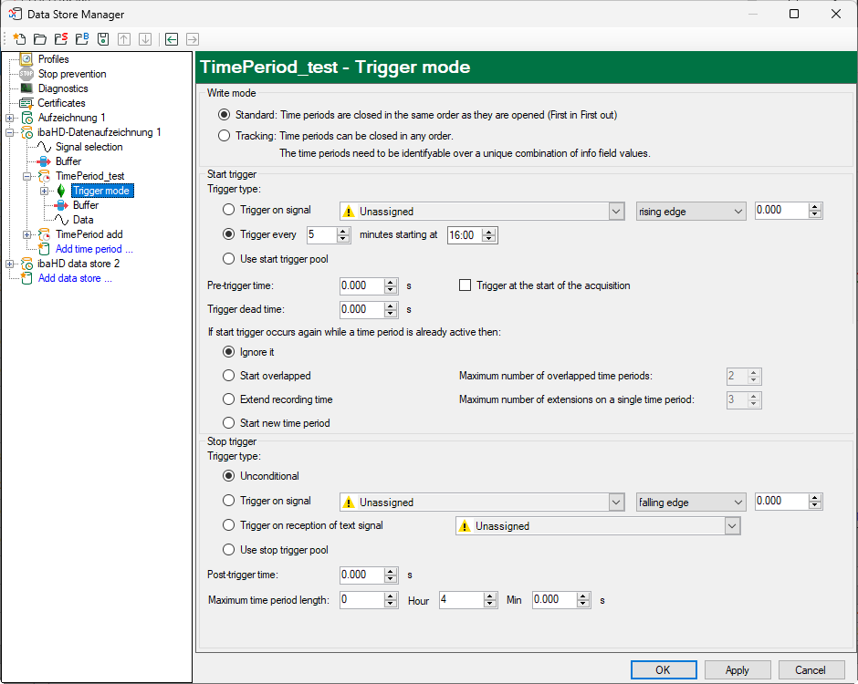 In standard mode, a stop trigger always relates to the oldest open time period. If acquisition is stopped or a new data acquisition configuration is applied, all open time periods are automatically closed.