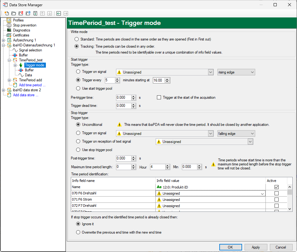 The ID of a time period is defined by one or more info fields. You can configure which info fields define the ID in the table for identification of the time period. To add the info field to the ID, assign a signal and enable it by checking it. The signals are acquired at the time of the stop trigger and ibaPDA then queries the time period store to identify the times whose ID info fields correspond to the signal values.