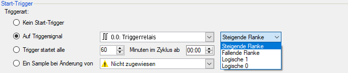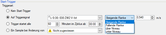 Wenn Sie ein Messsignal oder ein virtuelles Signal als Trigger verwenden wollen, wählen Sie die Option Auf Triggersignal. In den Feldern daneben legen Sie die Eigenschaften des Triggersignals fest.