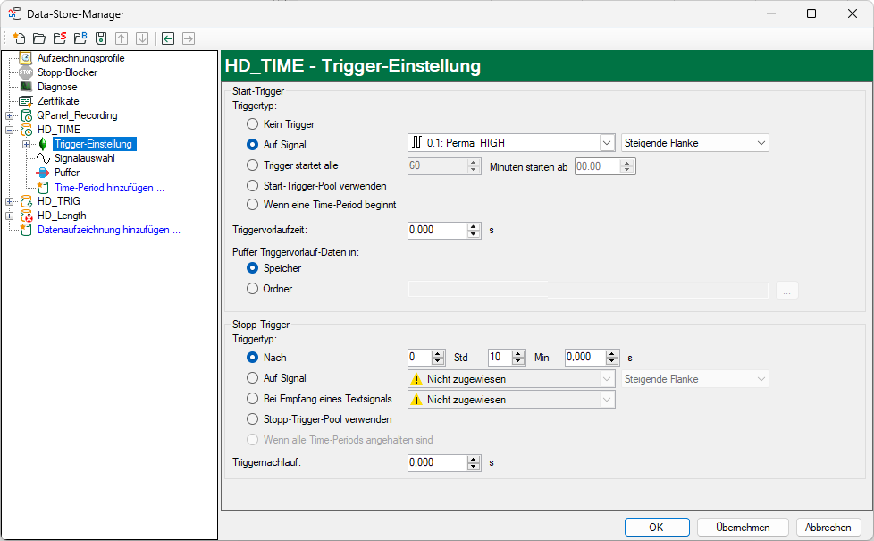 Im Knoten Trigger-Einstellung nehmen Sie Einstellungen für Start- und Stopp-Trigger für die getriggerte Datenaufzeichnung vor.