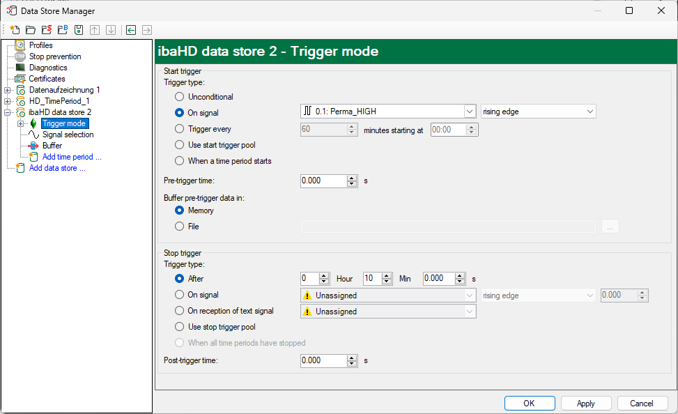 If this function is selected by entering a time, ibaPDA precedes the live data with the buffered data from the pre-trigger buffer. The saved pre-trigger buffer is continuously overwritten and always contains the latest data. The buffer can either be saved in the computer memory or in a file.